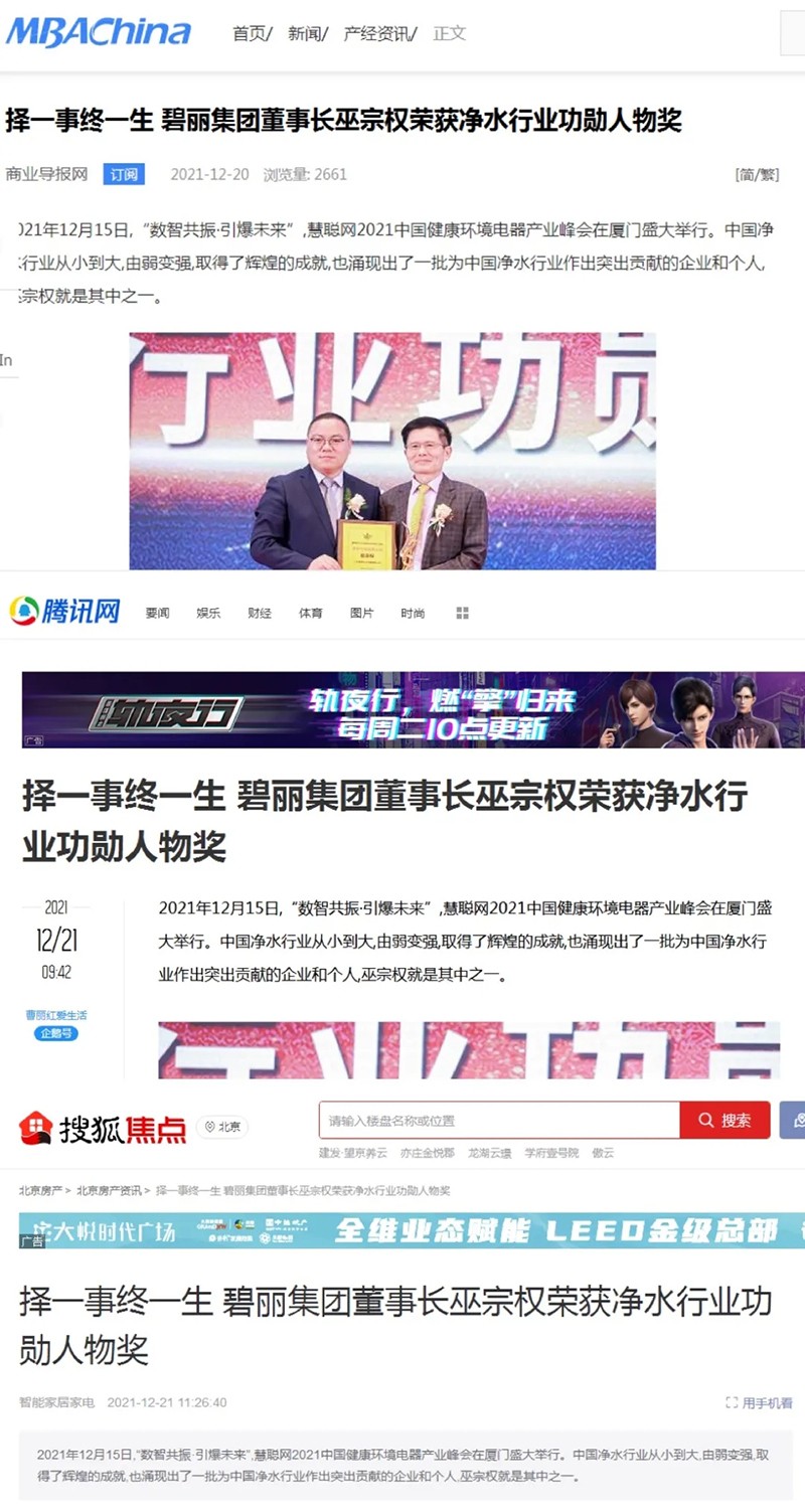 搜狐網(wǎng)、今日頭條、騰訊新聞、南方企業(yè)新聞網(wǎng)、中華網(wǎng)快訊、現(xiàn)代家電網(wǎng)等平臺深度報道了碧麗創(chuàng)始人巫宗權(quán)先生在凈水路上的心路歷程,其不為繁華易匠心的高尚品質(zhì)值得被贊頌。