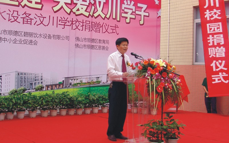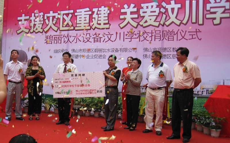 2009年4月,在汶川地震一周年之際,為了盡快幫助汶川受震災(zāi)區(qū)重建家園,讓汶川的孩子們早日回到自己心愛的校園,讓孩子們喝上健康衛(wèi)生的水,碧麗公司向汶川縣正在重建中的6所學(xué)校贈送節(jié)能王數(shù)碼高背板飲水機,為災(zāi)區(qū)的重建出一份力量,“大愛無疆,情系汶川”,碧麗關(guān)愛汶川災(zāi)區(qū)的孩子,為災(zāi)區(qū)孩子送上健康水是碧麗人的心愿。
